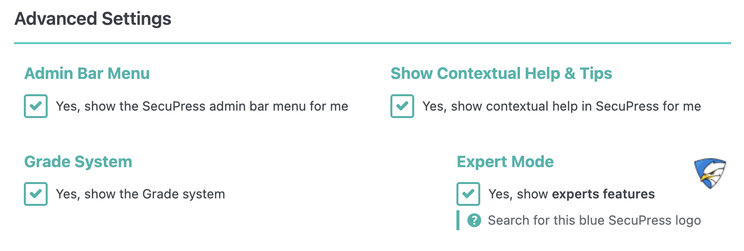 But you can also find this setting in the Dashboard module, we're talking about the 4 advanced settings: Admin Bar Menu, Show Contextual Help & Tips, Grade System, Expert Mode.