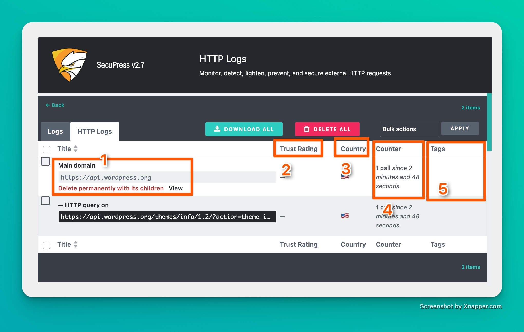 - Informative labels about the request type, such as GET, POST, whether it's HTTP or HTTPS, whether it's a WordPress or SecuPress URL, etc.All these columns are clickable filters to refine the search.