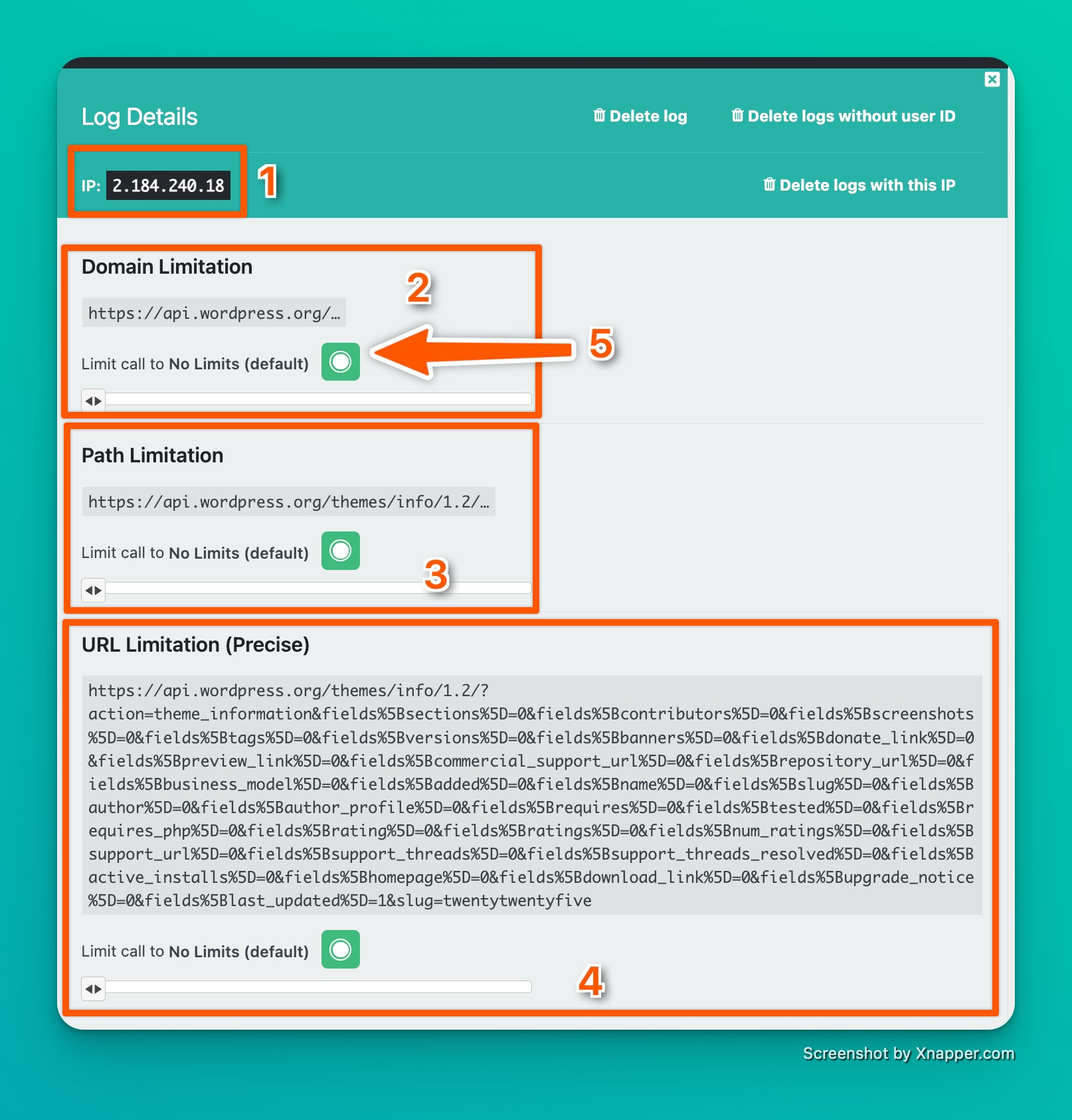 By moving the slider, you adjust the maximum number of calls to this domain, including all paths and parameters. This ranges from "No limit" to "Blocked," including 1 call every 5 minutes, up to 1 per day.