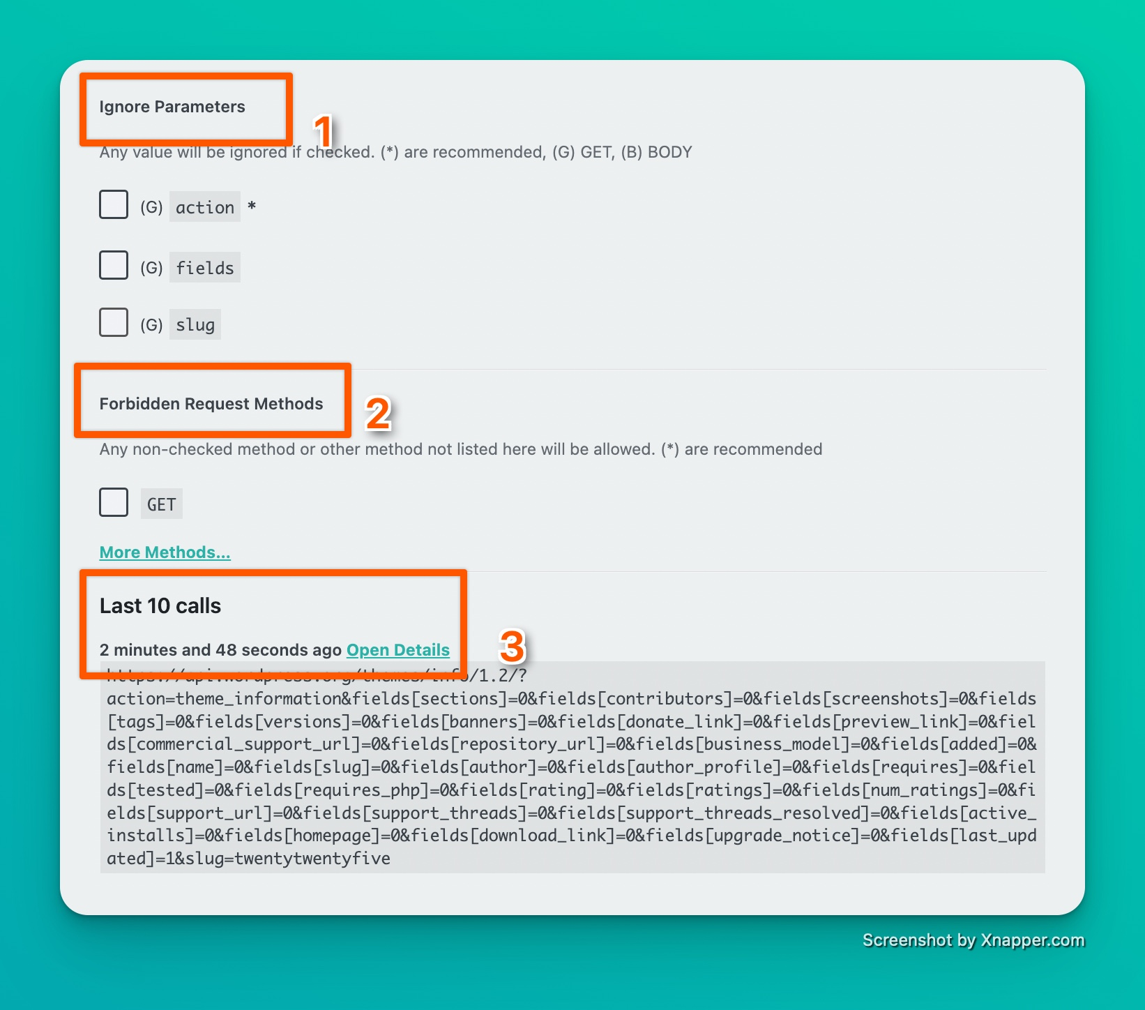 The parameters to ignore allow you to avoid relying on a dynamic parameter, for example, time=170574435788 , which changes with each call. This would prevent blocking calls because the URL is different. Check the parameters you know to be dynamic to avoid relying on them and respect the blocking.